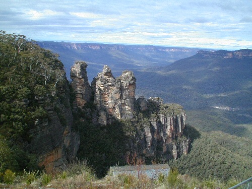 Zuerst sind wir nach Katoomba gefahren, wo man die Hauptsehenswuerdigkeit in den Blue Mountains, die „Three Sisters“ sehen kann, eine Felsformation, die aus drei nebeneinanderstehenden Sandstein-Monolithen besteht.