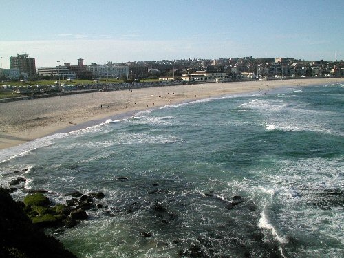 Gluecklicherweise hat es einen Wetterumschwung gegeben. Also habe ich mich entschlossen, Bondi Beach zu besuchen. Bondi Beach ist wohl der bekannteste Strand von Sydney im Suedosten der Stadt gelegen und mit Bahn und Bus zu erreichen. Die Sonne schien und neben den Surfern waren auch einige Leute im Wasser schwimmen. Bondi Beach liegt in einer sehr geschuetzten Bucht, aber der Wellengang und die Stroemung sind sehr stark.