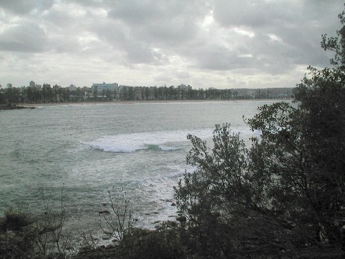 Obwohl das Wetter sehr unbestaendig war, bin ich heute mit der Faehre nach Manly gefahren, eine etwa halbstuendige Faehrfahrt durch den Hafen von Sydney. Ich hatte Glueck, auf der Halbinsel Manly schien die Sonne. Ich bin vom Faehrhafen durch die Fussgaengerzone zum Strand gelaufen und war ueberrascht, wie viele Surfer (mit Taucheranzuegen) im Wasser waren und auf den hohen Wellen gesurft sind.
